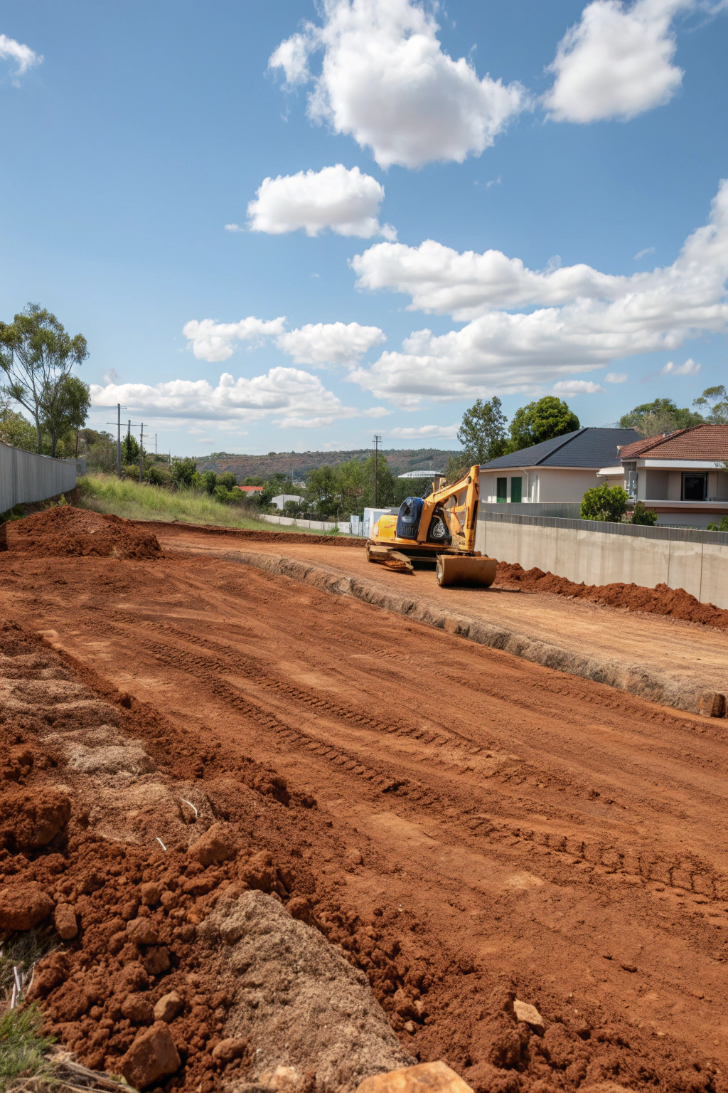 Sloped sites need cut and fill work to create level building pads. We cut soil from higher ground and use it to fill lower areas, then compact everything to create stable, graded platforms. This is common in areas like Belgian Gardens and Mount Louisa where many blocks have natural slope.